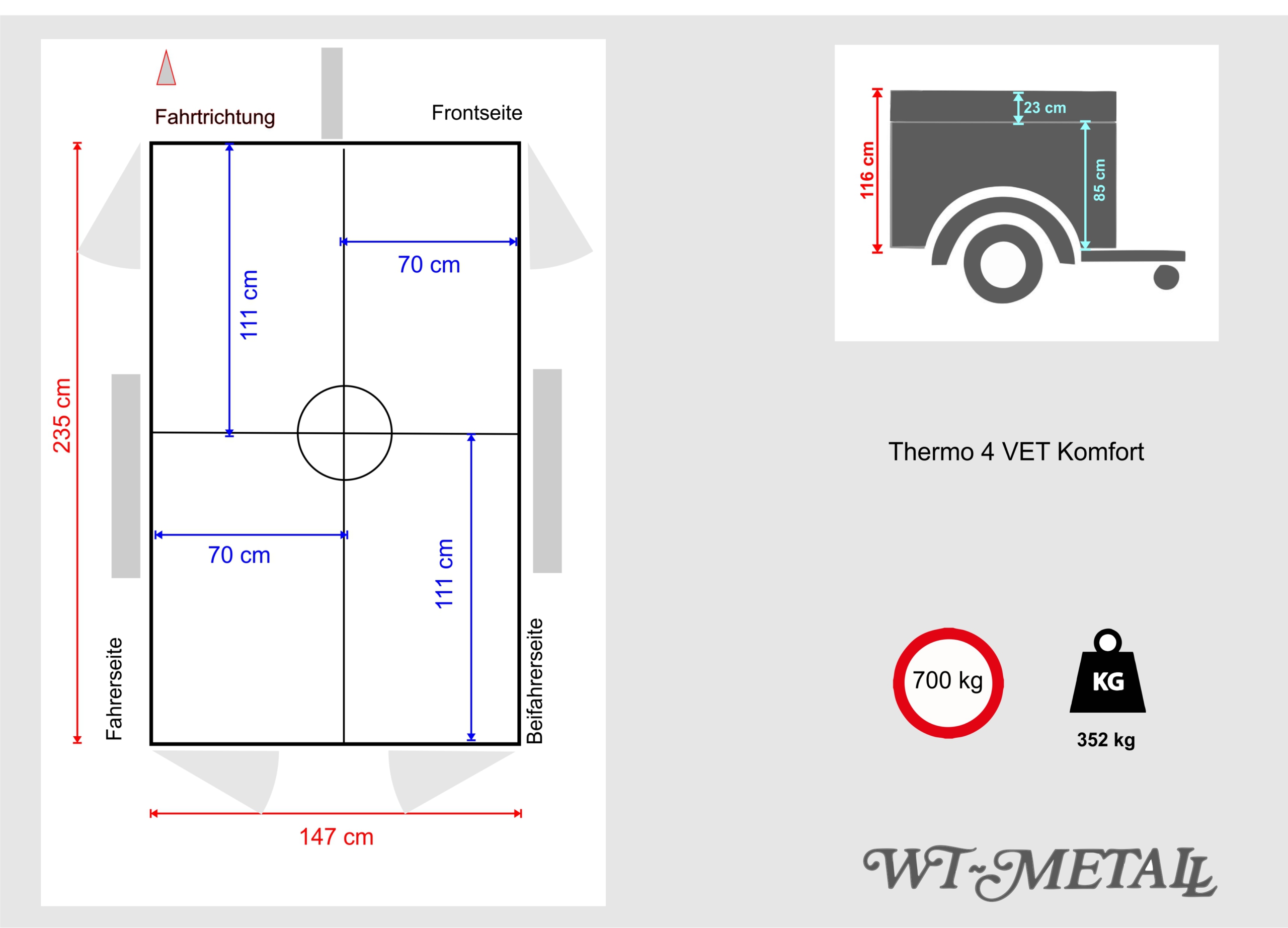 | 75 kg | 353 kg | 700 kg | 147 cm | 235 cm | 98 cm | 85 cm | 70 cm 2x | 111 cm 2x | 70 cm 1x | 111 cm 1x | 23 cm | ||